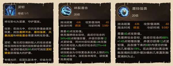 2、战盾体系也有两个技能碎裂盾击和盾挡强袭。前者可以群拉回血,后者附带控制。