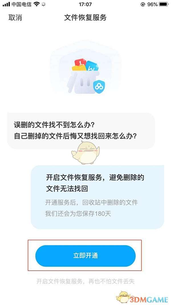 4、在“文件恢复服务”的页面中,点击下方的“立即开通”按钮。