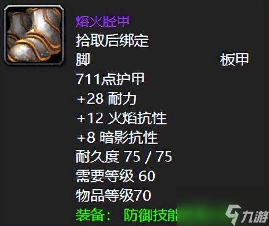 熔火之心荣誉出品的熔火胫甲,各位看官大佬可别小看了这一件火抗装备,这可是实打实的网红鞋,因为其高额的火抗以及不俗耐力还有那4点的防御技能提高,也是让得左可狂暴战右可MT的大佬直呼“这个装备很强力,兄弟们我先毛了”,我呸,是我先拿了,带你们飞,冲啊,奥利给!