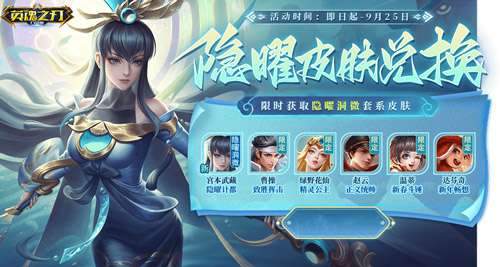 8月19日-9月25日,隐曜皮肤兑换活动开启!全新隐曜洞微系列皮肤宫本武藏-隐曜计都、曹操-致胜挥击、绿野花仙-精灵公主、赵云-正义统帅等奖励等你来拿!其中宫本武藏-隐曜计都还享限时折扣兑换!优惠多多,不容错过!
