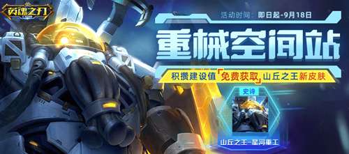 山丘之王化身宇宙工程师,修筑空间站!8月19日-9月18日,“重械空间站”活动限时开启!活动期间,参与重械空间站活动,完成任务并积攒建设值,当建设值达到一定数值后,即可免费获取山丘之王-星河重工皮肤!