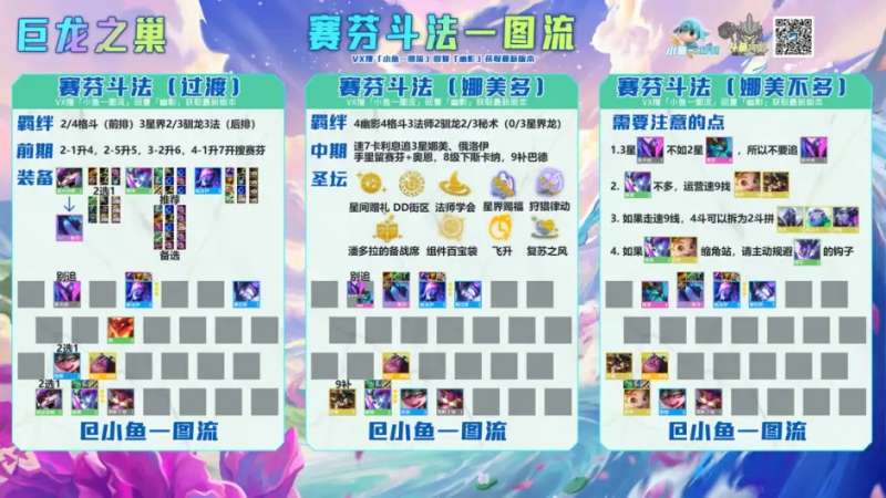 2-3阶段:星界牌、斗士牌、驯龙牌全抓,娜美不来可以崔丝塔娜带装备打输出,肉装给斯卡纳带着,2-1升4,2-5升5,3-2升6,6级没质量就搜,然后看个人喜好,6级追7级追都可以,7级可以挂4斗,且赛芬概率高,实际没那么严格,缺质量就小搜下