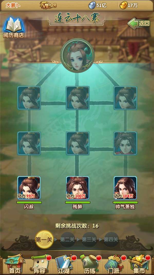输出角色:选择几名拥有高额单体或群体伤害的角色作为队伍的主要输出力量。可以选取江湖中有着“剑神”之称的角色,他们往往拥有破绽打击和致命一击的能力,使得在瞬间爆发阶段能快速拿下敌方关键角色。