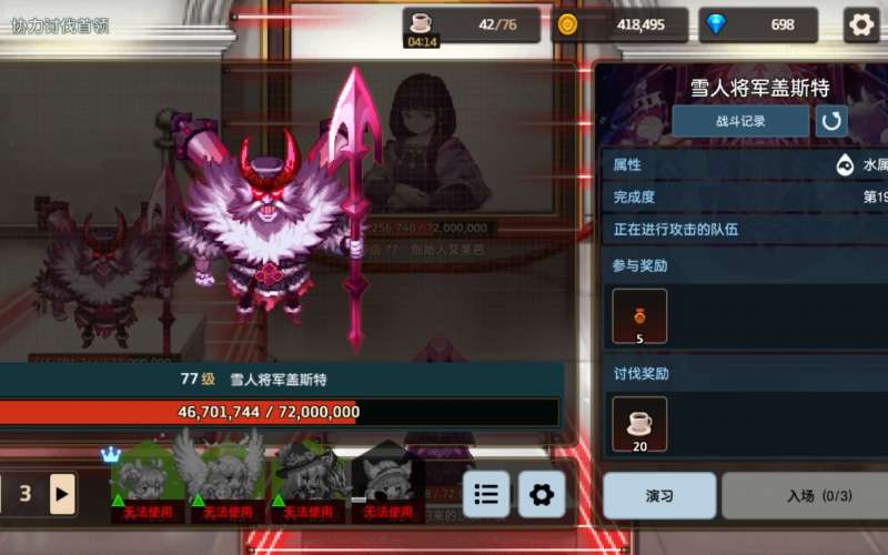 第一步就去选择一个适合自己的阵容,这里推荐的话选择土队是最好的。本身作为光属性的雪人将军后面为了把土神给抬起来,就改动成为了水属性,这样一看,克制关系中,最好用的就是土队了。游戏中较多人选择的压力就是土羊三破队,后面换一个输出也要可以打,而且队伍的伤害高,相信很多玩家手里都是有这个阵容的。