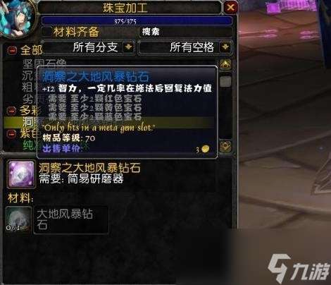 然后我打开了T4套装头部的宝石镶嵌界面并放入了一颗多彩宝石:洞察之大地风暴钻,可以很清楚地看到其效果已经可以被激活了(如果不能被激活,则文字描述是灰色而不是高亮的),即一旦激活就可为人物附加了12点智力和概率性施法回蓝的效果,只要我按下镶嵌宝石按钮,相关效果就会出来。至于那个12耐力的宝石可以无视,它不会影响我们的展示,因为这个角色全身就两件装备5个槽。