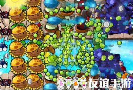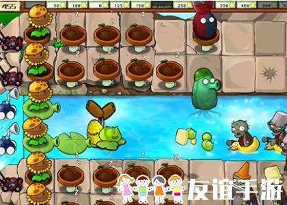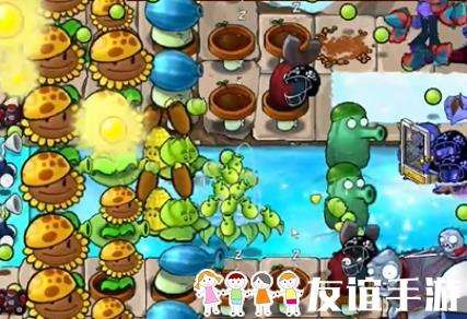 4、然后在向日葵右侧种植一列冰冻西瓜大喷菇,在泳池中种植一个豌豆荚许愿池。