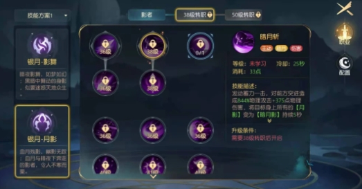 技能:月影突袭,暗月斩,月陨反,极裂斩等技能,还有永夜,月影撕裂等被动技能。