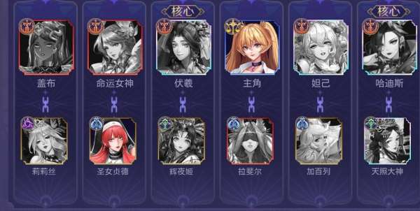 阵容的核心是伏羲和哈迪斯。伏羲能够为己方提供大量增益并给敌方挂上debuff,而哈迪斯的dot伤害也相当不俗。盖布提供生存和嘲讽;命运女神不仅能净化加攻,还能给敌人加上破甲,降低其防御力;妲己补上输出和控制,总体来说非常均衡。从神方面:贞德给命运女神加上亡语,使其阵亡后依然能提供大量的增益。辉夜姬提供免伤,加百列给妲己提供暴击爆伤而天照大神则能持续性的给哈迪斯叠加伤害,非常契合dot队多回合的打法。