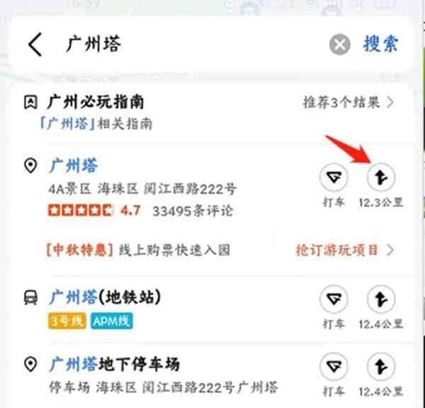 第二步:小编这里以广州塔为例,在首页搜索框中输入想要到达的目的地名称或关键词,点击搜索。在搜索结果中找到目标地点,点击目的地右侧路线图标,如下图所示。