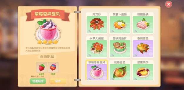 第二道菜是苹果棉花糖,需要玩家使用苹果和奇异果制作,其中苹果可自己栽种,也可从商店里直接购买。第三道菜是草莓奇异旋风,需要使用草莓和奇异果制作,而草莓可以在野外直接采摘获得。第四道菜是花香金鱼,需要玩家在锅炉里放一条金鱼,一朵毛毛花以及一个奇异果即可制作成功。