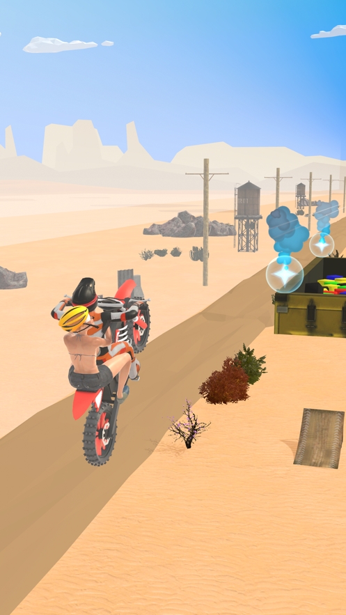 游戏采用了3d的画面效果,能够让玩家身临其境的享受到驾驶摩托车跑酷的乐趣。要注意在你的面前会出现许多障碍以及陷阱,在躲避的同时别忘了收集沿途的星星噢!