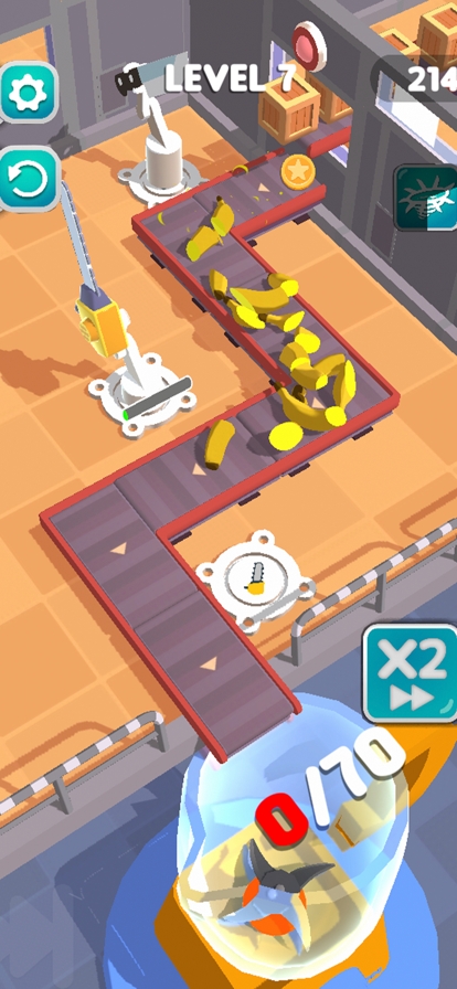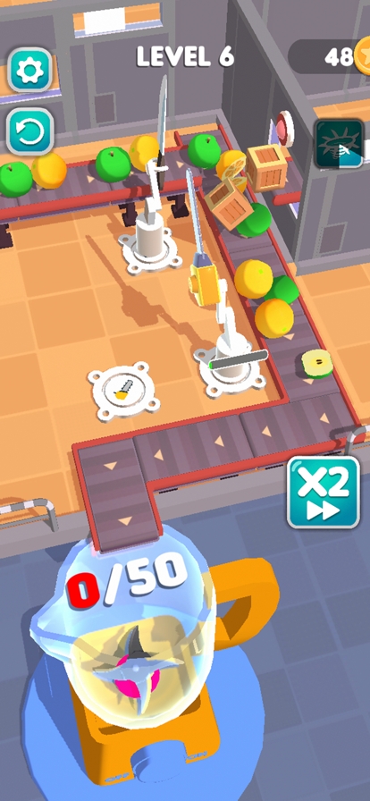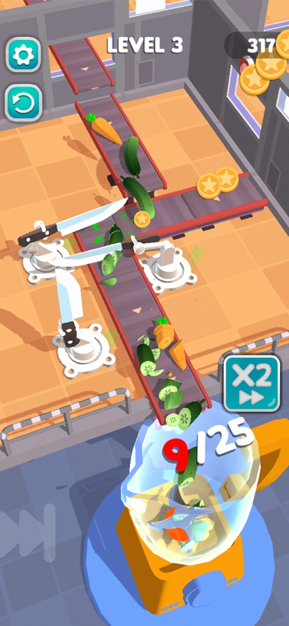 游戏中有一条很长的运输带,玩家需要在这里用水果刀进行切割。如果觉得只有一把水果刀不灵敏的话,大家可以选择升级设备,更换更多的水果刀进行切割。