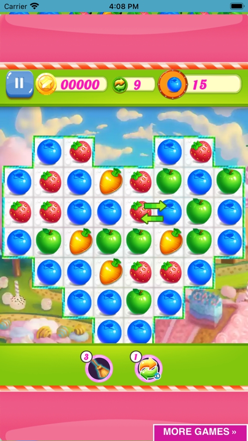 Fruit Swipe Manal中有很多的水果,玩家在进行通关时需要将相同类型的水果点击成行或者成列,当三个水果相同时,它们就能进行消除。在游戏中你还能购买道具,为自己添加相应的步数。