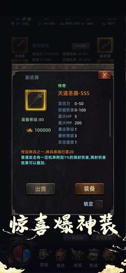 惊喜爆神装,装备无数:在游戏中,你将有机会获得无数神装,每一次战斗都有可能爆出神级装备。装备的属性和品质也各不相同,给你带来无尽的惊喜和提升感。