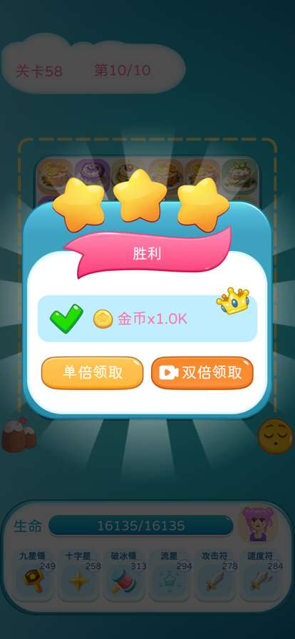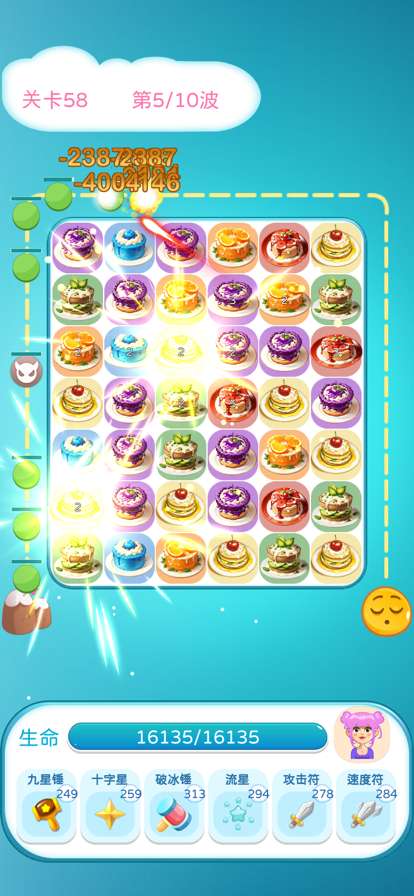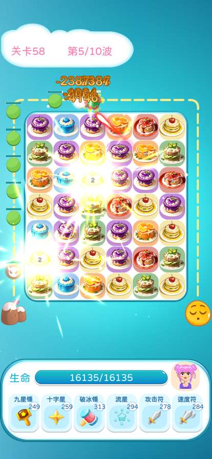 连线消除:在游戏中,玩家需要通过连线消除的方式,消除一定数量的相同食品或道具,以获得攻击和防御的机会。消除的食品和道具种类繁多,玩家需要灵活运用手速和策略来完成任务。