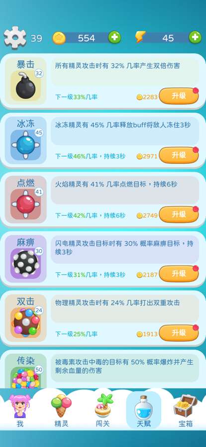 - 玩家可以升级「天赋」,强化各种美食精灵的额外效果,比如麻痹、毒、减速、爆炸、暴击等效果。