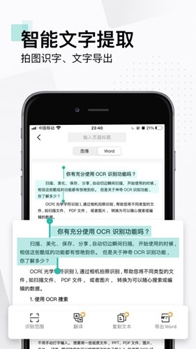 扫描全能王ios高级版是一款办公类型软件,能将你的手机作为一款扫描仪进行使用,可拍摄各类文档内容,生成对应的图片文件或者是制作成pdf文件你饿哦让,让你轻松生成对应的文档内容,更支持OCR识别,可以快速提取图像上的文字内容,无论图像的文字内容是英文还是汉字等,支持超多不同的语言,满足更多用户的OCR识别需求,更提供对应的文档转换,让你在手机上完成对应的文档内容转换。