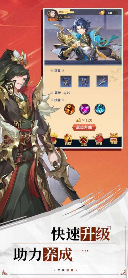 轻松的放置养成:游戏中的武将可以通过放置养成来提升等级和能力,无需繁琐的操作,只需轻松等待即可获得强大的战斗力。
