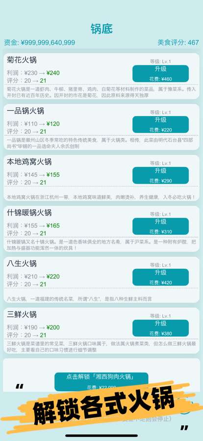 丰富的游戏内容:游戏中包含了多种不同的火锅和菜谱,玩家可以根据自己的喜好和市场需求进行选择和搭配。同时,游戏中还有各种任务和挑战,如限时活动、节日促销等,让玩家体验到更多的乐趣和挑战。