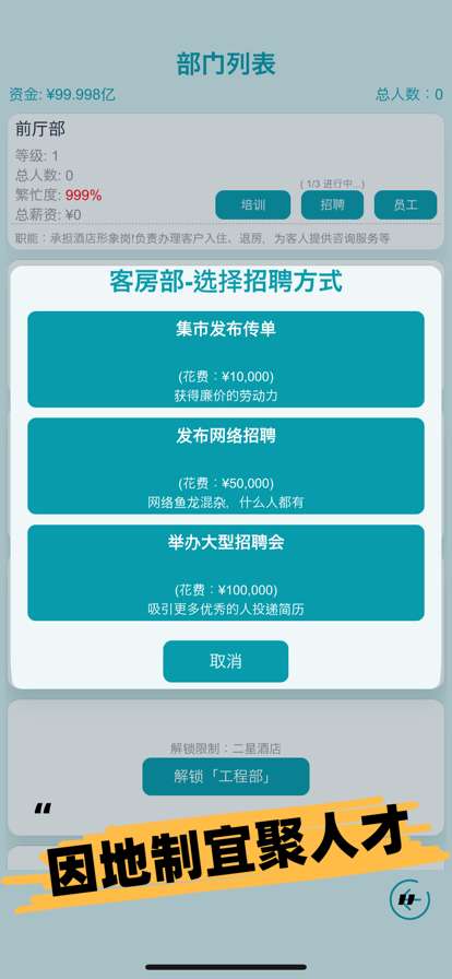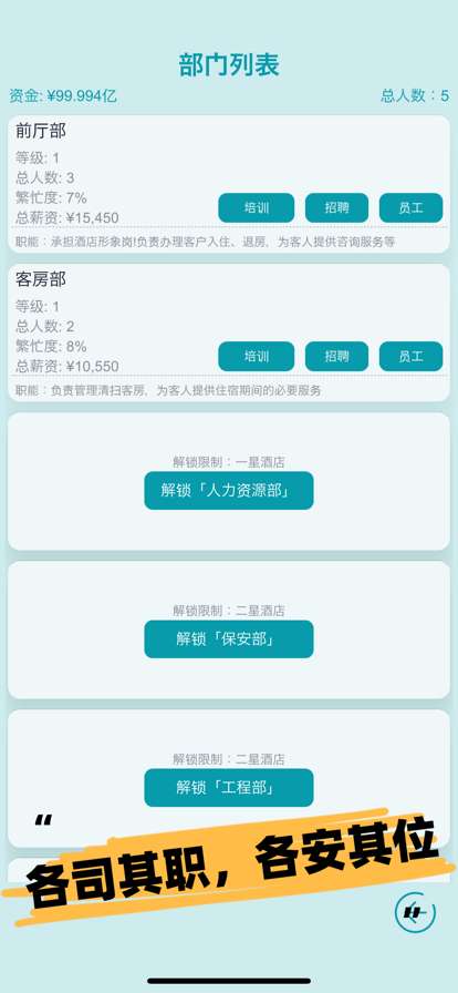 1、自由设置酒店中的多项决定,多个方面的决策都需要玩家自行决定。
