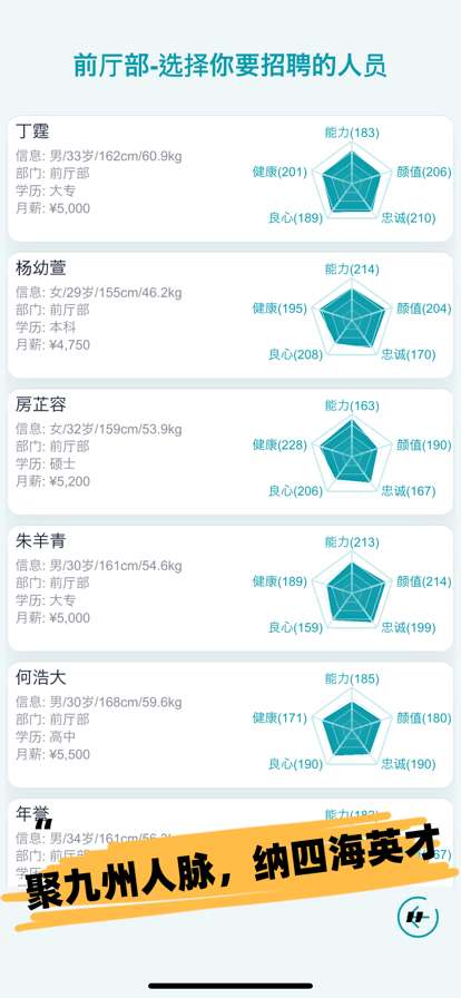 游戏内部员工设计了能力、忠诚、颜值、健康、年龄、身高体重等属性;不同的数值会触发不同事件,