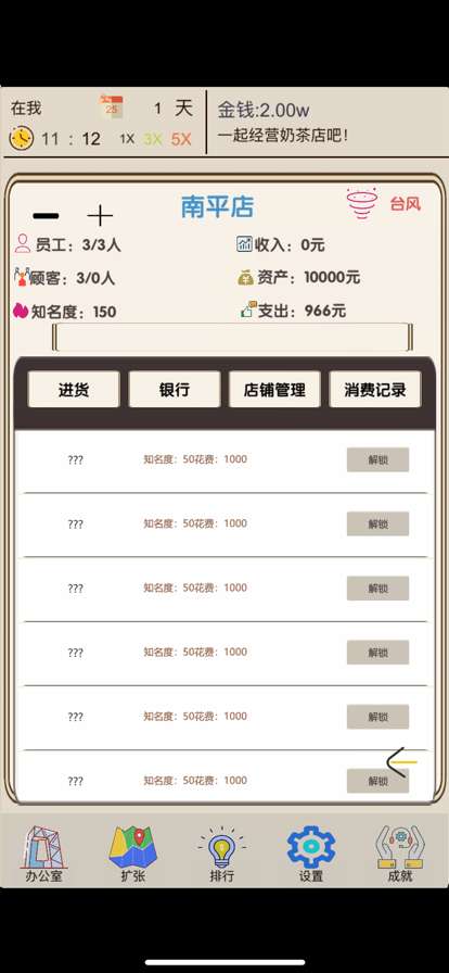 引入天气系统,同时天气会影响当天的饮品销量,所以记得看天气预报噢,过度的囤货可能让你的店铺血本无归。