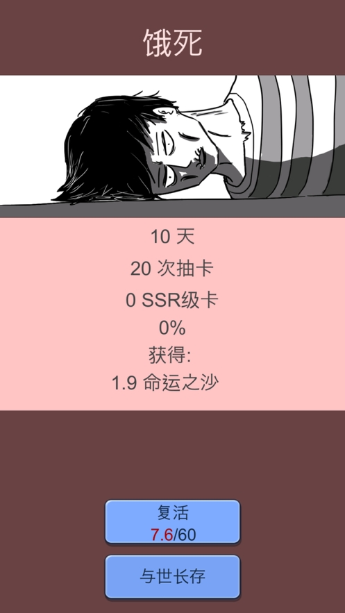 这也是生存游戏,抽卡的同时记得先让自己活下去,因为你的食物,水,可都是抽卡得来的。你还会生病,记得及时治疗。