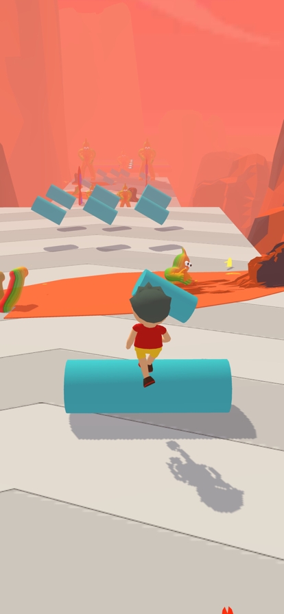 游戏中的地形复杂多变,有很多的熔岩和悬崖,玩家需要在赛道上收集圆柱的部件,这样玩家就能获得更大的圆柱进行闯关。在进行收集时,还有很多的积分奖励可以领取。