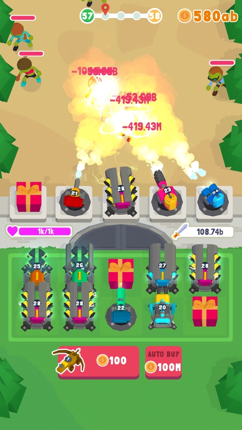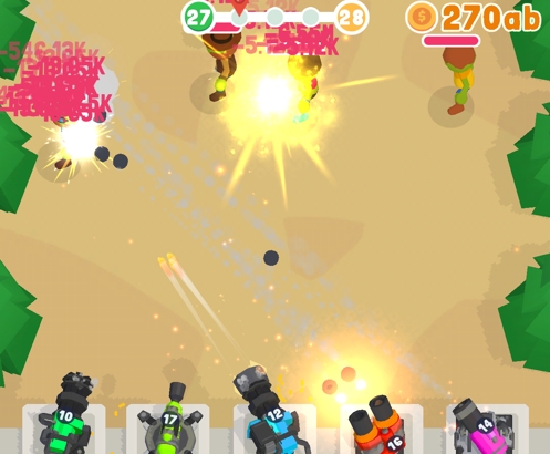 对面有好多僵尸想要入侵你的王国,快利用你的武器将它们全部消灭掉。在Merge Tower游戏中你要通过不断消灭僵尸来解锁更强大的武器。还要记得在对战中升级你的武器装备噢!