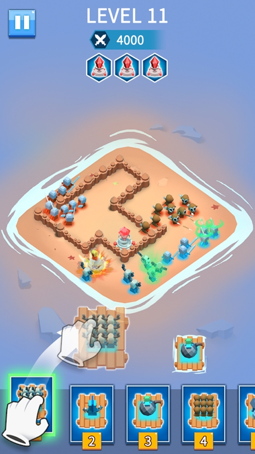 游戏为玩家精心设计了超多关卡,每一关的场景以及难度都是不同的。并且这里还为你准备了超多不同类型的兵种,合理的相同配合可以让你以弱胜强,从而获得更多的资源。