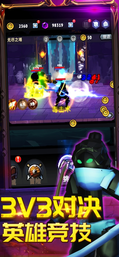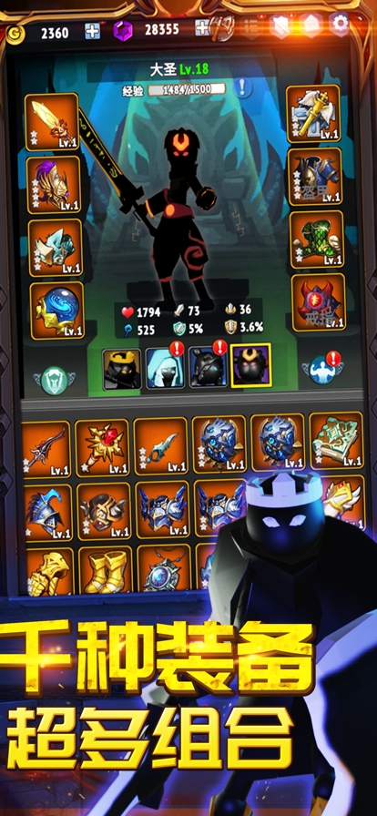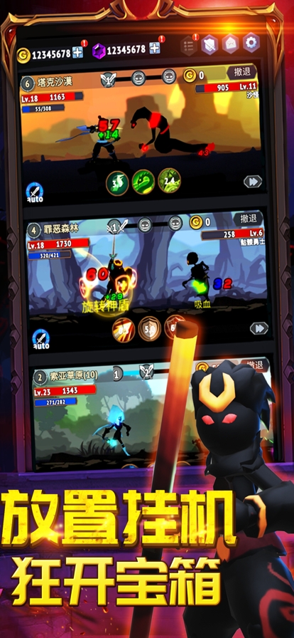 、这是一款火柴人题材的的放置动作RPG类游戏。几根火材棍组合成火柴人英雄,为了征服满是怪物的关卡!